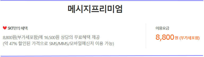 SK텔레콤 메시지 프리미엄 부가서비스는 부가세포함 월 8,800원에 16,500원 상당의 SMS/MMS/모바일 메신저 이용할 수 있는 정액부가요금제입니다. 약 47% 할인된 가격으로 SMS/MMS/모바일메신저 이용 가능합니다.