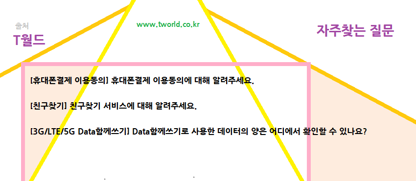 3G/LTE/5G Data함께쓰기로 사용한 데이터의 양은 T월드 홈페이지/앱에서 확인하실 수 있습니다.
